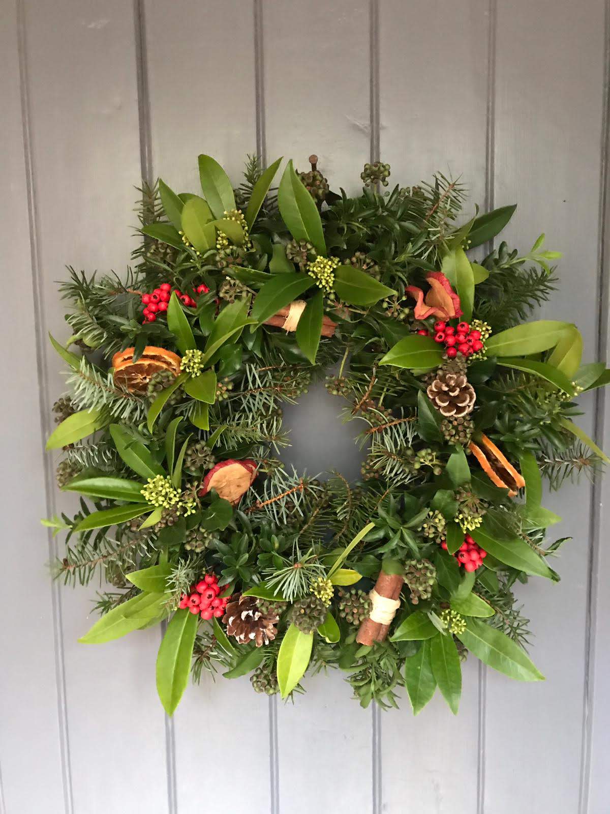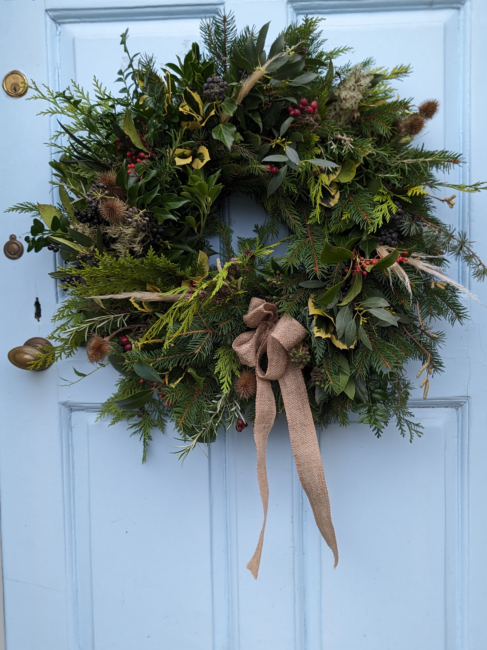A handmade Christmas Wreath 14" frame but likely 17-18" once complete.